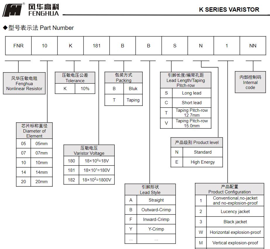 風(fēng)華高科K系列壓敏電阻器型號(hào)命名規(guī)則: