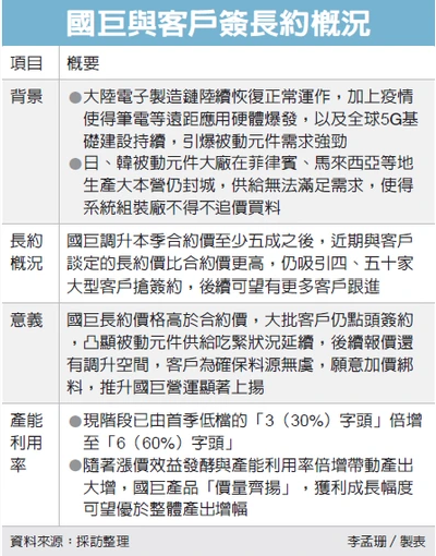 供應鏈透露,已有四、五十家以國巨作為主要被動元件供應商的大廠,已將過往向國巨拉貨約五成的比重改為長約,期限從簽約日起為期一年,由于合約價已鎖定,將可確保國巨獲利,降低未來大環境可能的風險。