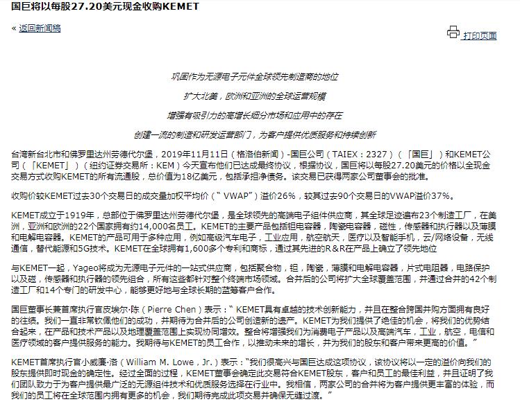 根據基美官網披露的消息,該交易預計將在2020年下半年完成,但要符合慣例完成條件并獲得所需的監管批準,交易完成后,基美將成為國巨的全資子公司