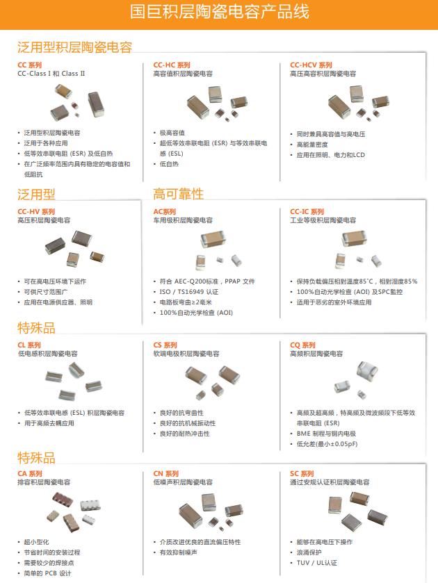 國(guó)巨的積層陶瓷電容為電路設(shè)計(jì)人員提供出色的性能、可靠性和成本優(yōu)勢(shì)。國(guó)巨提供多種類型的積層陶瓷電容(MLCC),包括一般品,高容,高壓,軟端和高頻。其中,高容MLCC是電容方面的高端產(chǎn)品,順應(yīng)電子行業(yè)朝向融合,多功能和小型化的趨勢(shì)。