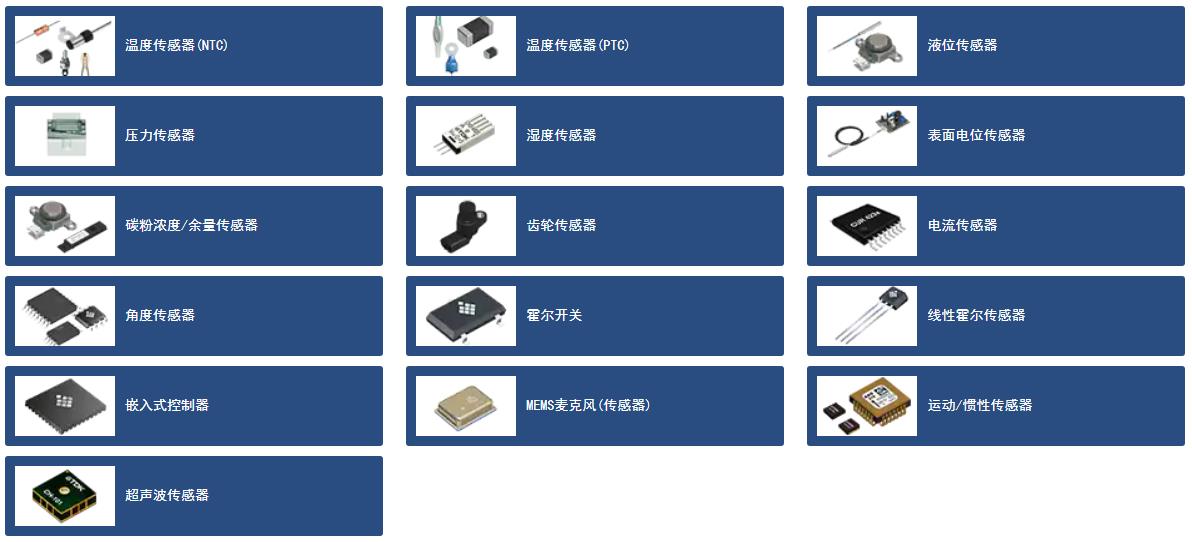 TDK公司的完整系列傳感器以TDK、EPCOS、InvenSense、Micronas和Tronics等產(chǎn)品品牌銷售,包括溫度傳感器、壓力傳感器、角度傳感器、電流傳感器。 精確的電流傳感器是電動(dòng)汽車的智能電源和智能電網(wǎng)不可缺少的。例如,溫度傳感器和傳感器系統(tǒng)被用來調(diào)節(jié)冰箱和空調(diào)系統(tǒng)的溫度,或者測量電動(dòng)汽車工作液的溫度。壓力傳感器廣泛應(yīng)用于汽車、工業(yè)電子、醫(yī)療工程和環(huán)境技術(shù)等用途?;诨魻杺鞲衅骰騎MR技術(shù)的磁場傳感器幾乎可以在任何需要測量位置、直線或旋轉(zhuǎn)運(yùn)動(dòng)、甚至電流的機(jī)器上找到。 基于運(yùn)動(dòng)的設(shè)備在三維空間內(nèi)檢測和跟蹤物體的運(yùn)動(dòng),從而使許多消費(fèi)電子設(shè)備(包括移動(dòng)電子設(shè)備、可穿戴電子設(shè)備、智能家居電子設(shè)備、汽車和工業(yè)電子設(shè)備)具有關(guān)鍵功能。對(duì)于運(yùn)動(dòng)傳感的高性能要求,TDK提供MEMS產(chǎn)品,如用于導(dǎo)航、運(yùn)動(dòng)跟蹤和運(yùn)動(dòng)控制以及光學(xué)穩(wěn)定的加速度計(jì)和陀螺儀。