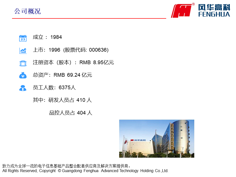 廣東風(fēng)華高新科技股份有限公司(證券簡稱風(fēng)華高科,證券代碼000636)成立于1984年,是一家專業(yè)從事高端新型元器件、電子材料、電子專用設(shè)備等電子信息基礎(chǔ)產(chǎn)品的高新技術(shù)企業(yè),1996年在深圳證券交易所掛牌上市。風(fēng)華高科自進(jìn)入電子元器件行業(yè)以來,實(shí)現(xiàn)了跨越式的發(fā)展,現(xiàn)已成為國內(nèi)最大的新型元器件及電子信息基礎(chǔ)產(chǎn)品科研、生產(chǎn)和出口基地,擁有自主知識產(chǎn)權(quán)及核心產(chǎn)品關(guān)鍵技術(shù)的國際知名新型電子元器件行業(yè)大公司。
