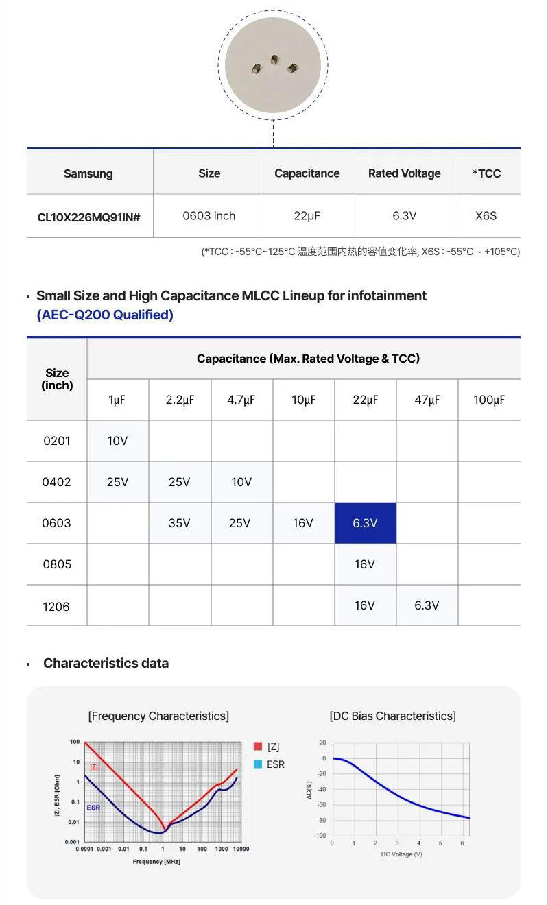 三星電機發布新品車載電容MLCC 0603 22uF 6.3V ,在0603inch(1.6x0.8mm)X6S(-55to105C)電壓6.3V上實現容值22uF,開發出可用于車載信息娛樂系統(VI)的疊層陶瓷電容CL10X226MQ91IN#并已量產,為此三星電機采用了獨有的陶瓷及微粒化電極材料和超精密的疊層工藝,以0603inch(1.6x0.8mm)、電壓6.3V、容值22uF產品的X6S